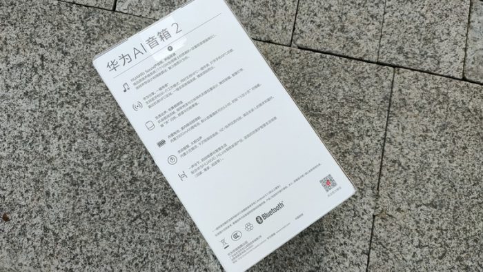 在包装方面依旧沿袭了华为的简约风格,洁白的底色中通过反差较大的黑灰色彩展现产品的全貌,顶部的华为AI音箱2 与菊花Logo宣告了产品的主权,或许为了避插电板做区分,在包装的左下角还特别印有电池版做说明。