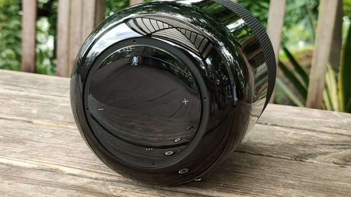 可不要小看这个差不多两个手掌般大小的智能音箱,拿在手上分量还是非常足的,沉甸甸的感觉但并没有前重后轻的感觉,整体重量排布还是非常均匀。在高156mm、直径、110mm的整机外观下,重量可达650g(含内置电池),整体重量控制得非常好,轻便的重量方便于日常移动使用操作。