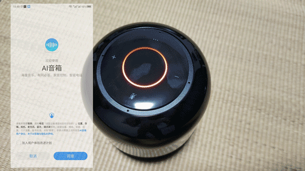 华为AI音箱2电池版在开机后还需要进行配对操作,通过扫描底部二位码先安装对应的AI音箱APP,然后根据介绍点击顶部的静音按钮等待出现橙色圈即可进入配网模式。