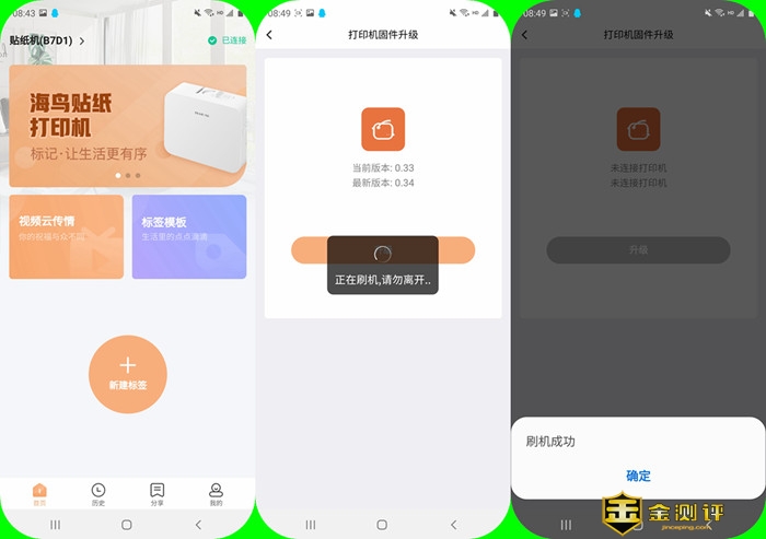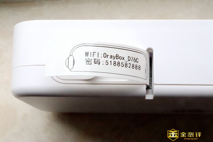 产品的logo在侧面,LOGO很简约的设计,从侧面可以看到产品主打的功能,以无墨打印、视频分享、条码二维码打印、分类模板为主。