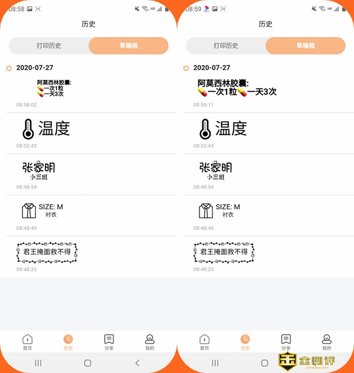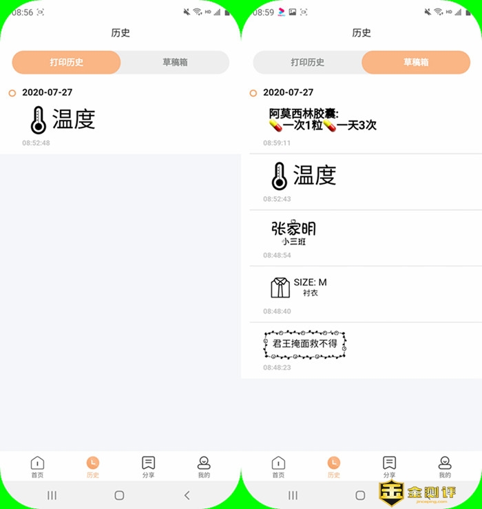上面也会有很多键盘模式没有的模板可供选择,有官方的标签模板,也有用户分享的各种模板进行。APP还有记忆功能,可以从打印历史及草稿箱中找到已编辑过打印或者没打印的标签样式。