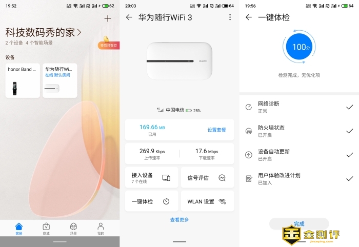 因为个人使用的有荣耀手环3和荣耀亲选空气净化器套装,所以App不需要下载早就安装好了,打开后App会自动提示当前有华为的产品可以进行连接,经过简单的操作后就可以进入到华为随行WiFi3的管理页面了,里面的一键体检可以完成随行WiFi3的自检。