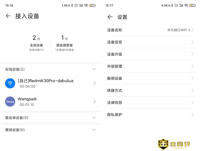 此外APP也提供类似路由器的管理项,如联网设备管理、设备固件升级等,不足的是设备管理中没有限速功能,也没有流量限额功能,只有禁止联网,对于像我这样能用到的用户来说,略显遗憾。