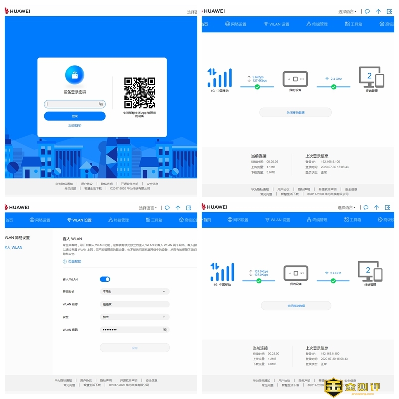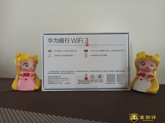 背面突出了4G全网通,150Mbps高速上网、1500mAh电池,工作时长高达6小时、支持高达16台设备同时接入、华为智慧生活APP管理,以及官方微信等产品信息。