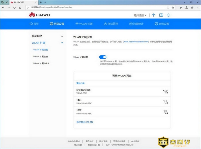 比较有意思的是这个WLAN扩展,可以通过华为随行WiFi 3连接其他路由的WIFI,这样就不会消耗4G卡的流量了,变成了路由器的功能,这个功能很实用。