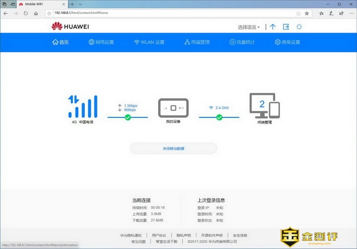 基本功能都设置好后,技能进入华为随行WiFi 3的管理界面,首页可以看到,4G电信网络正常,不过WIFI只有2.4G,没有5G WIFI比较遗憾,话说2.4G的WIFI带宽比较低,所以如果是多设备之间要相互访问,速率会受影响,如果有5G频段的WIFI,那就会提升不少了。