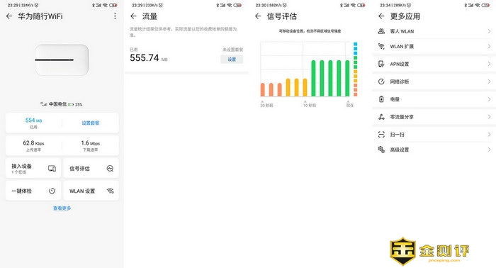 华为随行WiFi 3也可以通过华为只会生活APP来管理,这个APP的功能和WEB端在功能设置方面基本上没有差别,不过多了一个信号评估的功能,这个功能就很主要了,我们可以拿着华为随行WiFi 3,到处走走,然后找到一个4G信号最好的地方来使用,这样的网速才会比较好一些。