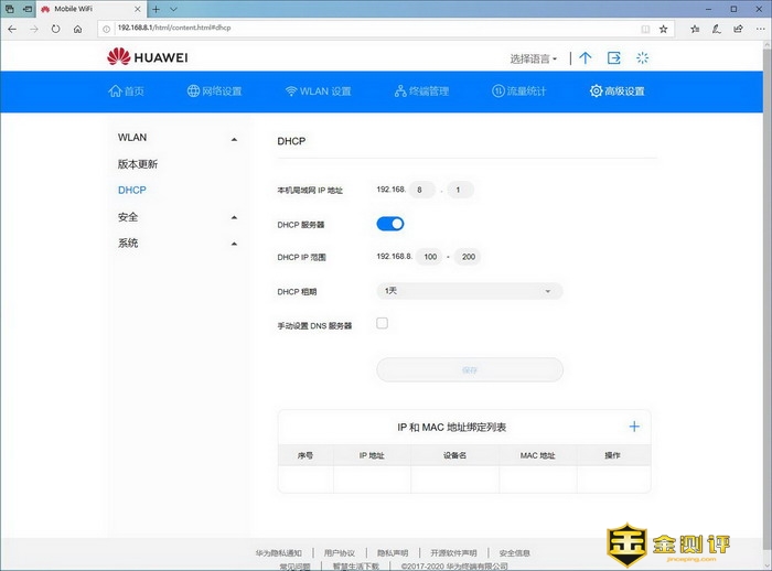 DHCP里可以修改华为随行WiFi 3的管理IP地址,还能设备DHCP池的起始和终点范围。