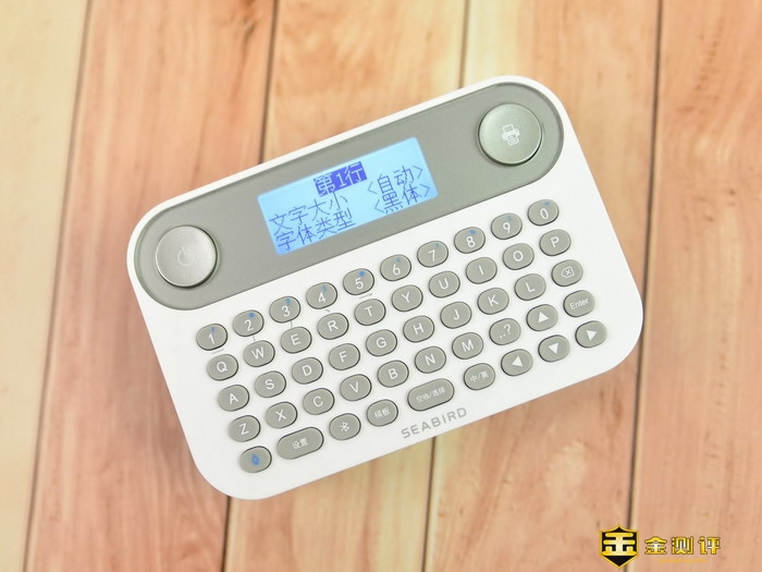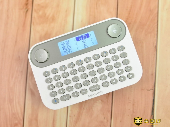 海鸟贴纸打印机的三围是124*83*36.5mm,重量约为246克,机身正面上方的左右两侧设计有两个大按键,分别是左侧的开关按键和右侧的打印=键。中间则是显示屏。下方则是全键盘的设计,键盘的最下面一行和右下角还有些功能按键。