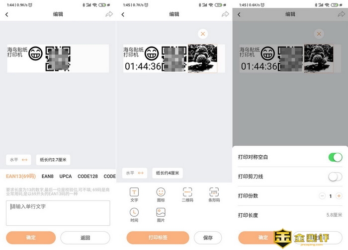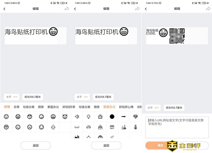 除了文字输入以外,海鸟贴纸打印机还有更多的功能,首先是表情包,类型和数量还挺多,然后是二维码,可以输入英文数字和符号来生产二维码。还能插入时间和图片,不过图片会变成黑白的,。