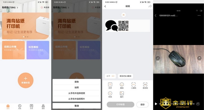 然后用海鸟贴纸APP连接以后,即可在APP种打印。海鸟贴纸打印机的APP里有三个功能菜单,比较有意思的是“视频云传情”,这个功能可以自己拍照或者摄像,或者从手机中选择照片和视频上传,上传后就会进入标签编辑页面,页面会显示出一个微信图标和一张二维码,示意使用微信扫描二维码,扫描以后,就可以看到之前上传的视频了,这个很有意思,用得好会有惊喜,图表中的视频,就是我自己扫描二维码后下载并播放的视频。