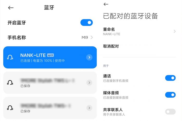 耳机与手机通过蓝牙配对连接后,在手机的蓝牙列表中,可以看到耳机的连接状态和剩余电量,在NANK LITE耳机设备的右侧还有aptx的标识,aptX是高通目前使用的一系列专有音频解码器,有着高解析度和低延迟的优点。