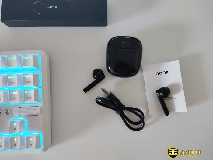 配件盒子打开后,我们可以看到产品和其配件,共有南卡Lite耳机充电盒1个、耳机2个、Type-C电源线1根、以及产品说明书和产品合格证。
