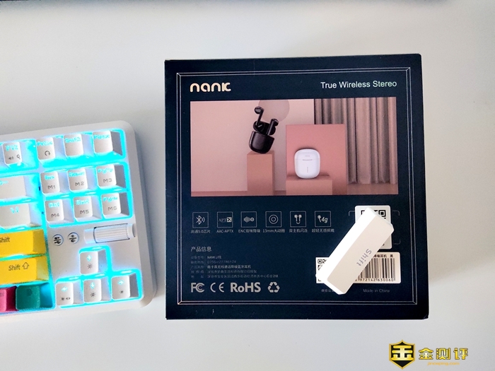 在盒子的背面,是南卡Lite耳机黑白款的渲染图,下边是具有6个耳机特征的图示和文字;盒子的最下部为产品的一些信息、国际认证的一些图标,以及产品二维码和公主号等信息。