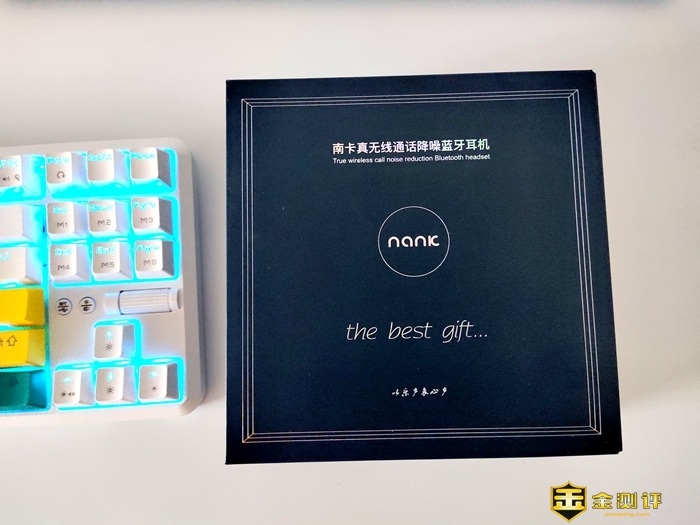 南卡Lite的外包装采用的是揭盖设计,外裹一个抽拉式的镶套,整体以深蓝色为背景,烫金色印刷,设计简洁大气。在外镶套的正面中央部委是南卡的logo,上部印有中英文的产品名称“南卡真无线通话降噪蓝牙耳机”,下部印有“以乐声表心声”及英文“the best if...”字样。
