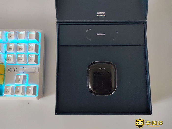 拉开镶嵌套后,可以看到一个上翻盖盒子,打开后可以看到耳机的充电盒镶嵌在泡沫海绵体的凹槽里,里面是南卡Lite耳机和一个产品的配件盒。耳机充电盒安放在一个黑色的泡沫模具中,这样可以做到在运输中保护产品不被损坏。