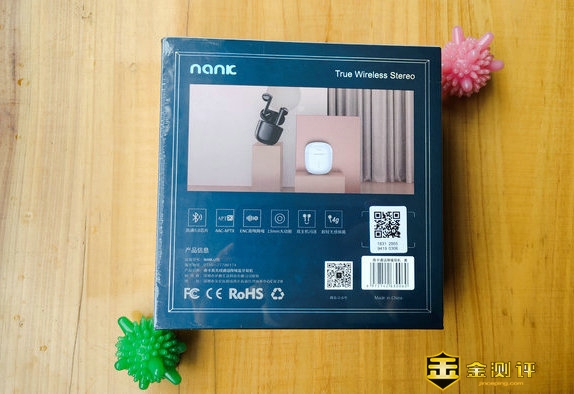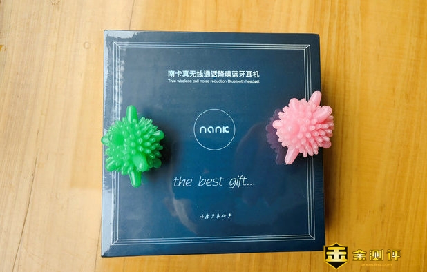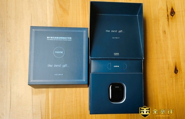 首先我们来看看这款产品大包装盒正面,还是延续了南卡一贯的,黑色幽默风格。同时在外面用白色凹版印刷字体,写着南卡真无线通话降噪蓝牙耳机,还写着英文The best gift(最好的礼物)下面是中文——以乐声表心声,用词相当的有美感。