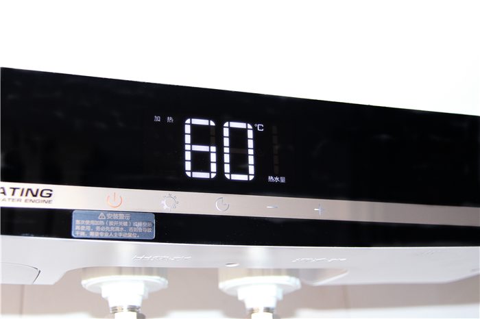 正中位置是LED数码显示屏,超大的字体可以清晰显示工作状态、当前温度、设定温度、工作模式等数据。五颗带有指示灯的触控按键,隐藏在下面的金色装饰条中间,点按触感清晰准确,反应灵敏。比较有趣的是S1带有热水量显示(最右侧柱状灯),原以为能直观使用时长,可惜只是一个从30℃开始每十度点亮一格的形象展示,而不是计算热水器里面有多少水的。