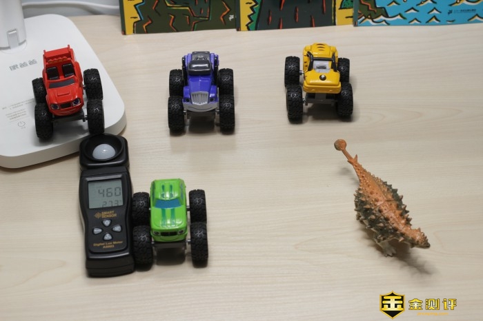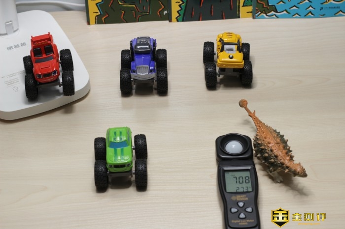 眼爸爸学习台灯在小绿的照度为820lx,恐龙的照度为821lx,小黄的照度为863lx,小蓝的照度为885lx,小红的照度为834lx。台灯均匀度为885/820=1.07,与官方宣传的1.2相比还要优秀。