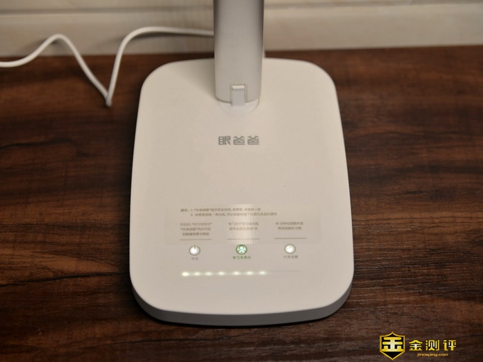 首先是最下方的底座,长21cm,宽14cm,这种长方形的结构比很多台灯的圆形底座可以更好的照顾小书桌。底座上印有眼爸爸的品牌Logo,底座上设计有三个按键,每个按键上都有对应的功能说明,在上方还有使用提示。