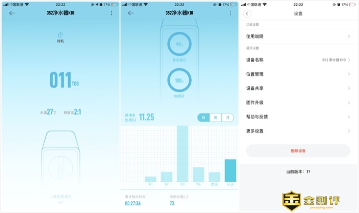 352厨下净水器青春版K10米家App操控主页面显示:机器状态、实时监测更新TDS值、当前水温、纯净水和废水比例2:1,上滑主页面会出现以日周月为单位的统计表格,能够清晰看出每天的使用情况。同时还附带:使用说明、设备共享功能、固件升级等基础功能。