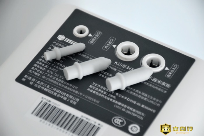 352厨下净水器青春版K10的出入水口设计在主机顶部,产品的对应参数也设计在顶部,浓缩水出口纯粹点来说就是废水出口。