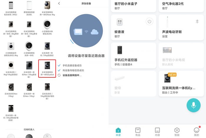 潮范君是个不折不扣的Mi Boy,手机、电视盒子、净化器、电视机、窗帘等等,都是小米生态链的产品,通过小爱同学或米家App,可以查看和远程操控设备,不仅智能而且方便。云米Eyebot作为互联网洗衣机,也支持小爱同学语音操作,看着设备列表逐渐丰富起来,我的智能家居快要凑齐了。