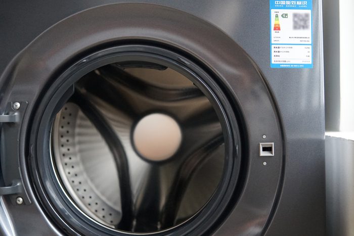 洗衣机正面贴有中国能效标识,可以看到云米互联网洗衣机Eyebot为1级,能耗低更环保,日常洗衣不会产生过多电费。