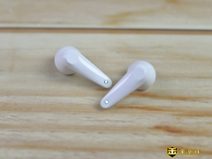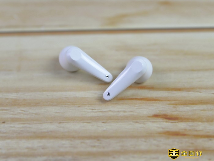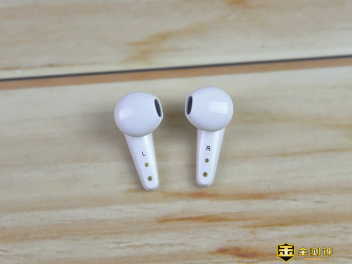 取出左右耳机,就可以看到在左右耳机手柄处设计有2个金属触点,这就是用来给耳机充电用的。