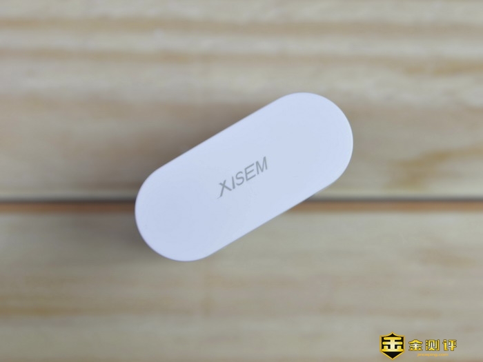 西圣XISEM真无线蓝牙耳机ASN的充电仓外观设计有些特别,顶部平整,但是底部是椭圆形的,所以无法直立摆放。充电仓的顶部印有西圣的品牌Logo。