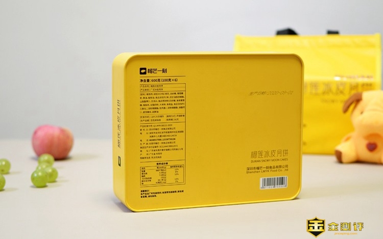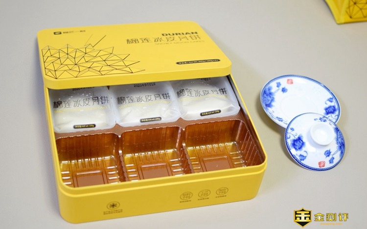 月饼盒是金属盒,正面有一只立体的榴莲图案设计