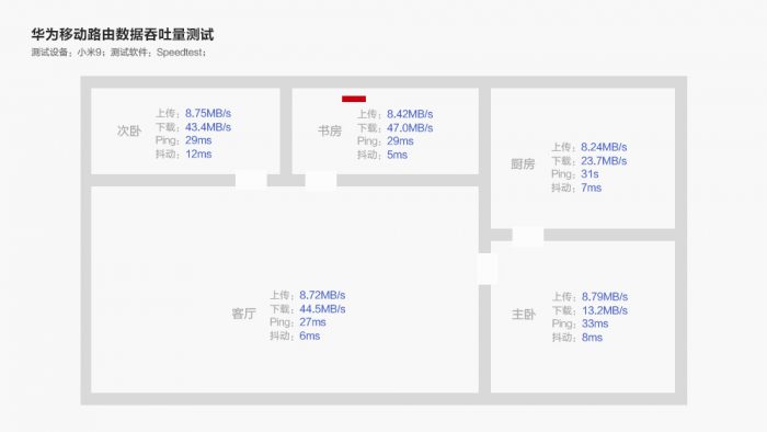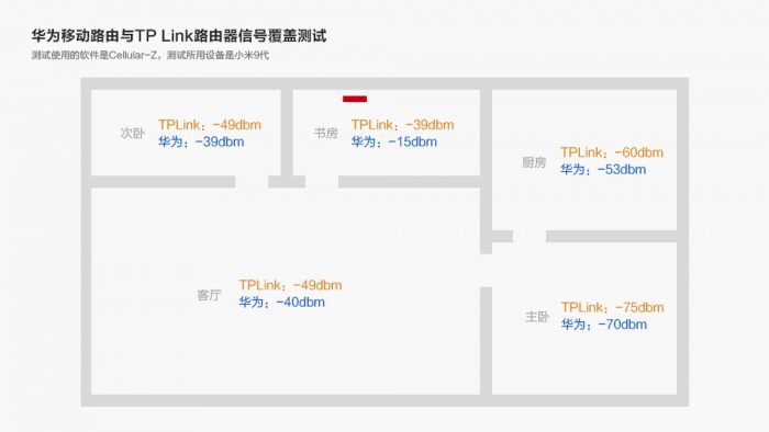 以上是我目前所居住的房间户型图,路由器放在书房的位置。使用Celluar-Z软件分别在不同的房间测试两台路由器的信号覆盖情况,以橙色和蓝色文字标记,具体数据如上图。分析数据不难发现,在多个房间中华为移动路由的表现都要更出色一些。