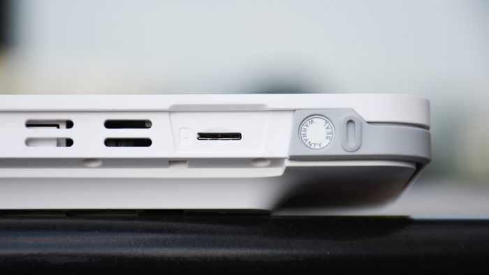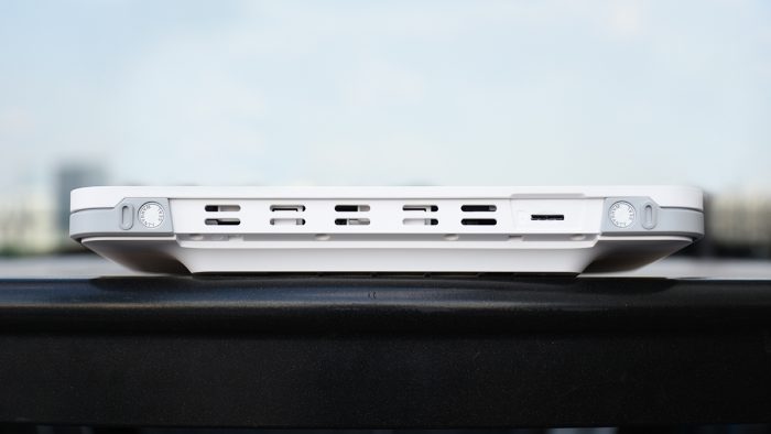 底部分布有大量的长条形散热格栅,最左侧预留有SIM卡槽,这部分也做了一个内嵌式的处理,刚好可以与底座部分完美契合。