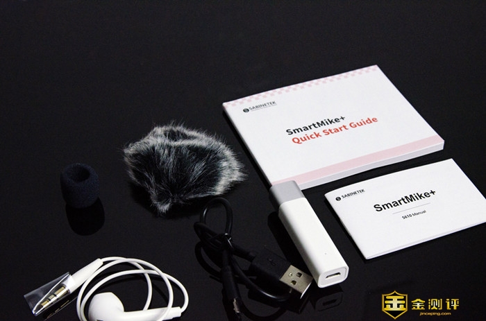 将产品从包装内取出,可以看到这款塞宾智能无线麦克风的配件很多,包括防喷绒毛罩、防风罩、智麦SmartMike+主机、单边耳机、USB充电线、收纳袋以及说明书等,这里来张全家福。