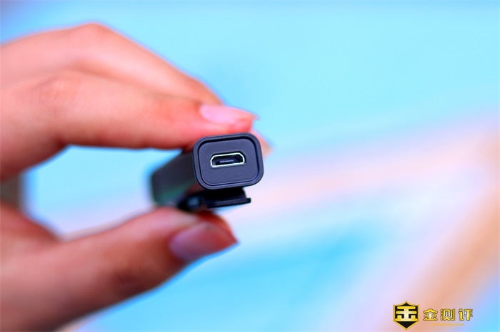 和耳机接口相对的也就是设备的底部位置是充电接口,本款塞宾智麦采用的是内置锂电池,110mAh的电容量满电情况下可提供设备5-6小时的使用时长,完全可以满足我们的日常拍摄使用需求,必要的时候可通过充电宝供电,也可以供电的时候使用,充电口为Micro-USB,不过小编更期待目前主流的Type-c接口,好用而且充电更快些。