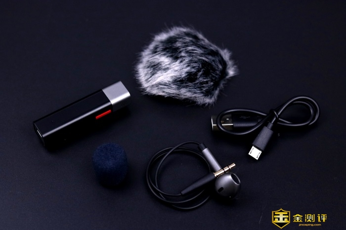 随麦克风附带的还有一个单向耳机、一根充电线、一个防风海绵和一个防风毛罩。