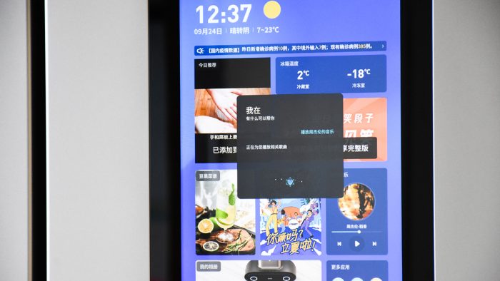 主屏幕保留了安卓系统的部分元素,但也针对冰箱产品的交互体验做了一些优化。顶部的状态栏显示有时间、工作模式、冷藏/冷冻区温度和WiFi联网状态图标;中间大面积排布有各种的小组件,比如时间/天气、新闻热点、冰箱温度等等,另外还接入了抖音、爱奇艺、豆果菜谱和酷狗音乐等第三方应用。