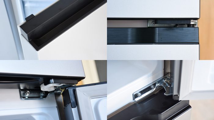 上下两侧的冰箱门都搭配了隐藏式的把手,即保证了视觉上的一体性,也照顾到了冰箱开合时的便利性。把手部分采用黑色金属材质,表面辅以拉丝纹理。转轴部分采用了高强度的铰链,开合的时候阻尼恰到好处。虽然是一些比较隐性的小细节,但实际处理的也是非常用心了。