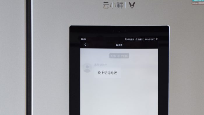 留言板功能可以在冰箱大屏和云米商城App之间发送信息,界面设计有些类似于微信,上手简单易用。比如晚上小姐姐在家做饭,而我还在加班的时候,就可以推送一条想吃什么的消息过去;或者我早晨取牛奶的时候顺便看了冰箱里还有什么食材,给小姐姐推送中午想吃什么的消息,总之玩法多种多样。