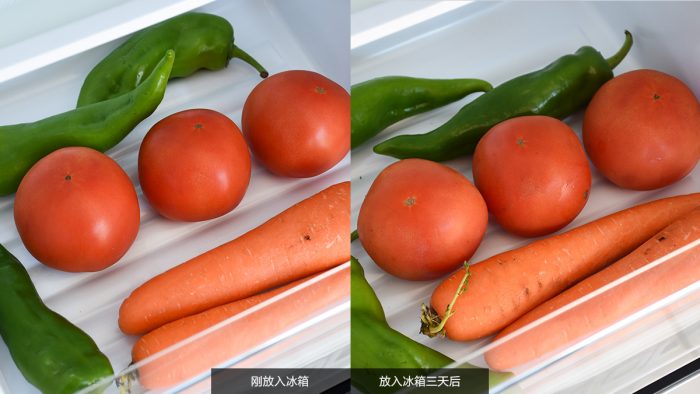 在体验期间,我也测试了草本杀菌功能的保鲜能力。在开箱的那天买了一些胡萝卜、尖椒、西红柿和苹果放了进去,上图左边就是刚放进去的状态;放置三天以后再观察几个食品的表面,仍然保持着一定的水润和光泽度,没有明显脱水或发霉的现象。