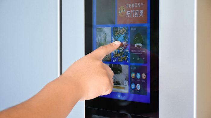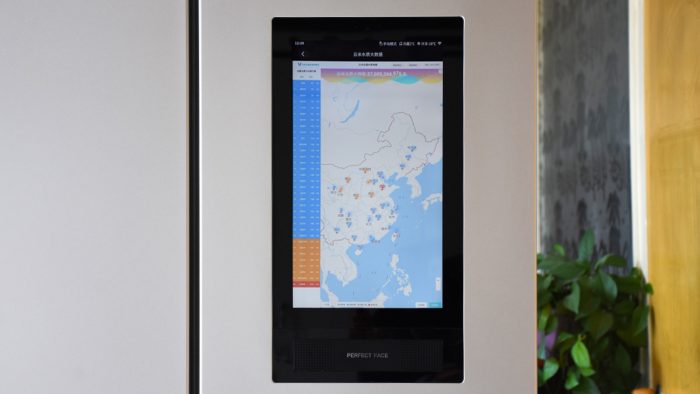 在右侧靠上的这扇门上设计有一块触控屏幕,也是这台冰箱主打智慧交互和全屋智能功能的控制中心。屏幕的尺寸比较大,纵向16:9的比例能够显示很多的内容,支持触控操作。屏幕下方还设计有两个扬声器格栅,搭配屏幕操作发出声音。