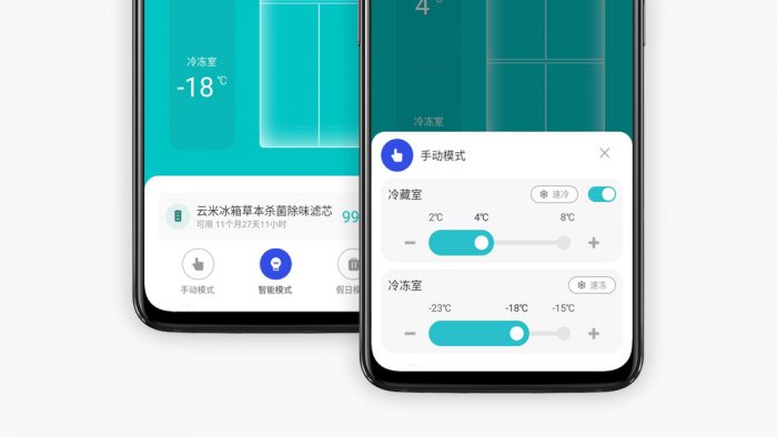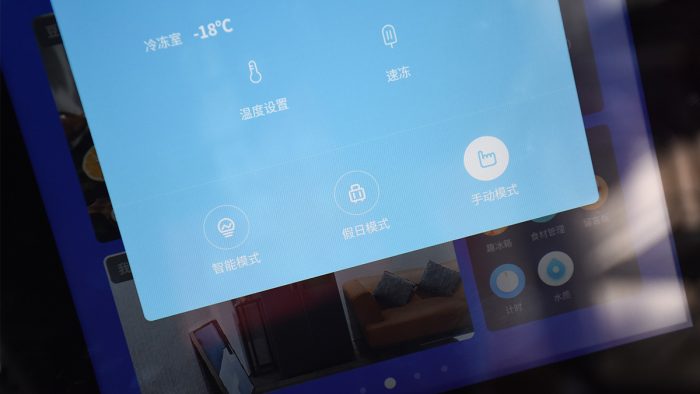 通过这块屏幕,能够更直观的调整冰箱冷藏和冷冻区域的温度,滑块的操作方式也向手机操作系统UI看齐,简洁易用。云米还为这台冰箱设计了三种工作模式,一般情况下推荐开启智能模式,冰箱内的温度会自动调节,也要更省电一些,当然也可以选择到假日模式和手动模式。