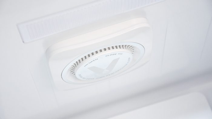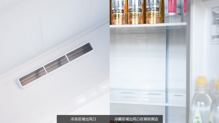 云米互联网冰箱采用的是风冷无霜的制冷方式,打开冰箱可以看到冷风出风口。相比传统的冰箱来说可以有效地避免冷冻区域产生厚厚的冰霜,杜绝抽屉打不开以及需要经常除霜的问题。
