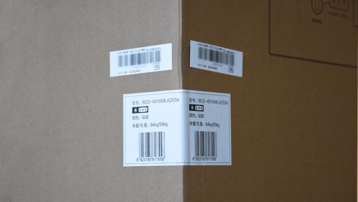 留心观察也不难发现,在箱体正面和侧边转角处中间的位置贴有不干胶标签,记录有冰箱的型号、配色和重量,并标记有条形码和序列号。