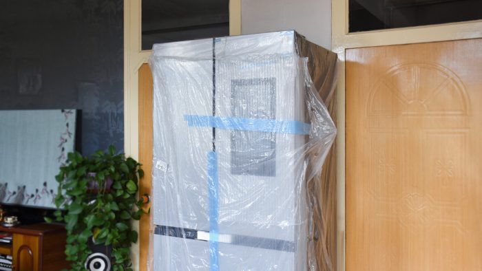 将纸箱和塑料泡沫全部拿掉,冰箱外侧还套着一层塑料袋,在屏幕一侧还垫着一层充气的缓冲垫。把这些东西和包装箱底座全部去掉之后,方可见到庐山真面目。
