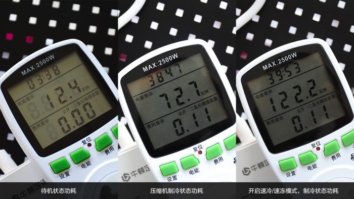 在体验期间,我也测试了冰箱工作状态下的功耗。实际数据显示,在正常待机状态下的功耗约为12.4瓦,压缩机开启工作时的功耗约为72.7瓦,开启速冷和速冻后压缩机工作功耗为122.2瓦。