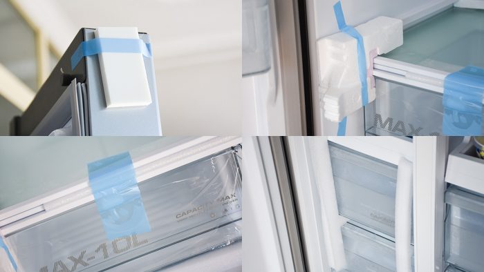 除了冰箱外侧,在门与门之间、内部多层隔板和抽屉之间也垫着塑料泡沫,其中很多零部件还用蓝色的胶带粘合固定,同样也是为了避免运输过程中掉落、变形产生损坏。