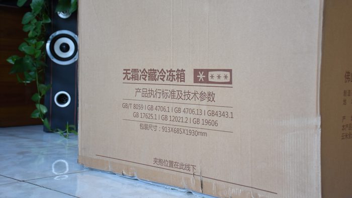 大件家电产品还是采用比较传统的包装箱,也就是瓦楞纸箱,由于冰箱本身的体积比较大,所以箱子包装显得更大一些。考虑到运输时候的需要固定结实,包装箱上打了三横两纵的扎带。