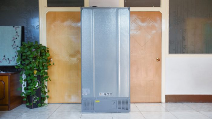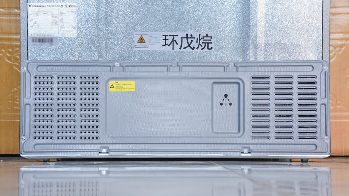 冰箱背部靠上方大面积被稍微浅一些的灰色盖板包裹,一体性要比家里之前那台老冰箱好很多。左下角贴有不干胶名牌,标记有这台冰箱的电路设计图和技术参数信息。中间贴有“环戊烷”的标签,也说明这台冰箱是通过环戊烷实现制冷的,也就是无氟冰箱。
