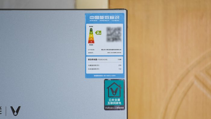 功耗也是人们在选购大件家电产品时候一个重要的衡量标准。云米互联网冰箱右上角贴有国家能效标识,属于2级能效标准,综合耗电量是每天1.04度。云米互联网冰箱采用的是变频压缩机和变频风机,可以根据冰箱内部的温度自动调节零部件的工作状态和转速,在保证制冷量的同时更加节约电量。
